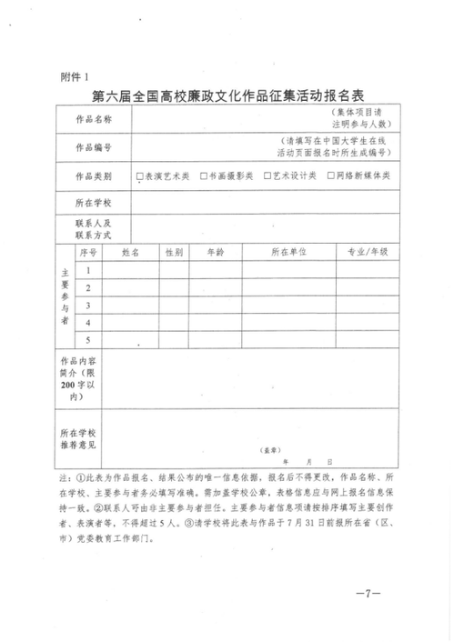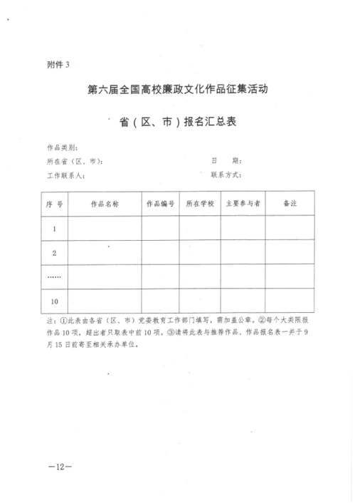 三、全国高校廉政文化作品征集活动省级评选工作由省委教育工委主办,湖南商学院、湖南省廉政建设协同创新中心承办。请各高校于8月28日前,按文件要求将本校优秀廉政文化作品及其报名表报送至湖南商学院岭南校区廉政建设协同创新中心204室。