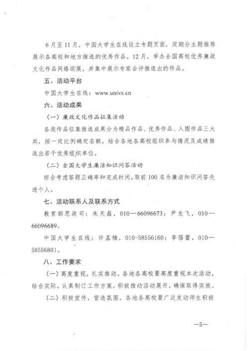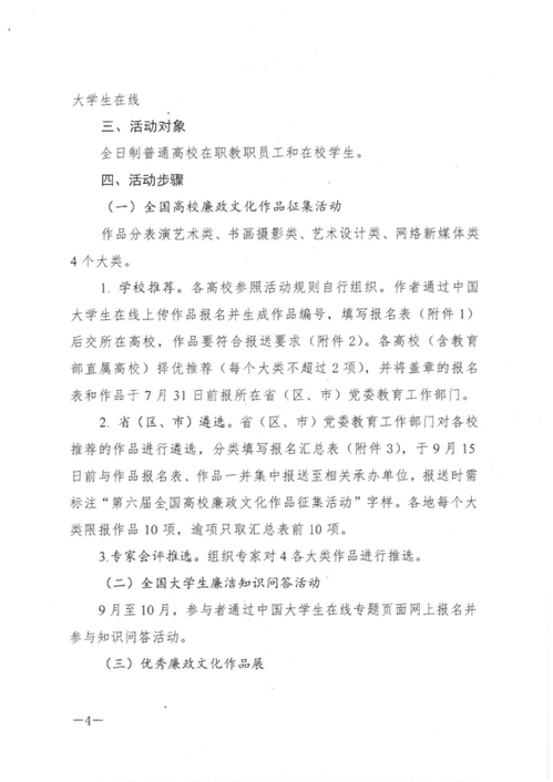一、请各学校高度重视,结合实际,认真制定工作方案,组织师生积极参与廉政文化作品创作活动和全国大学生廉洁知识问答活动。