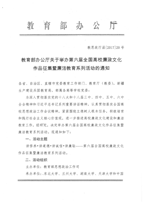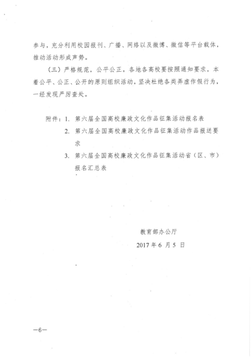 现将《教育部办公厅关于举办第六届全国高校廉政文化作品征集暨廉洁教育系列活动的通知》(教思政厅函〔2017〕20号)转发给你们,并就有关事项通知如下: